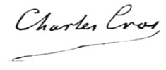 Né le 1er octobre 1842 à Fabrezan. Après son baccalauréat, obtenu en 1859, Charles entreprend des études de médecine qu'il n'achève pas. A partir de 1867, il fréquente différents cercles où se côtoient artistes et intellectuels en marge. Il rencontre alors Nina de Villard, qui devient sa maîtresse en 1868. Pendant le Siège de Paris, en 1870, Verlaine l'héberge. Pendant la Commune, il est aide-major. Cette année-là, en 1871, il rencontre Rimbaud qu'il accueille avec Verlaine. Sa liaison orageuse se poursuit avec Nina, jusqu'à la rupture en 1877. En 1878, Charles Cros épouse Mary Hjardemaal dont il a deux fils. Sa santé commence à se ressentir de sa vie de bohème, et de l'absinthe. L'année suivante son alcoolisme s'aggrave, sa femme tombe malade, et sa situation financière n'est guère florissante, au point que sa bibliothèque est vendue aux enchères publiques. Il meurt le 9 août 1889 à Paris.